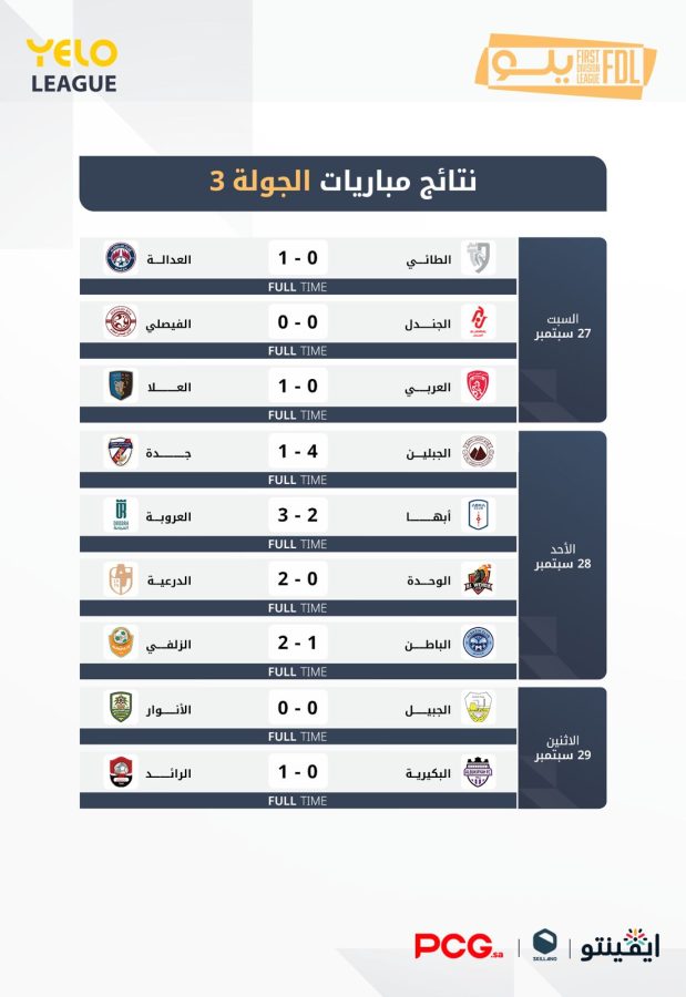 يذكر أن الجولة الرابعة من دوري يلو لأندية الدرجة الأولى للمحترفين ستنطلق يوم الجمعة المقبل 3 أكتوبر حيث يلتقي الزلفي مع أبها، العلا مع الباطن، والدرعية مع الجندل.
