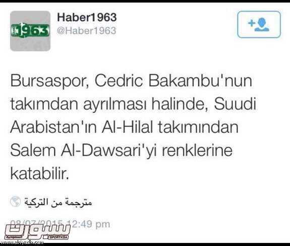 وكشفت صحيفة ” هايبر 1963 ” التركية أنّ إدارة نادي بورصا سبور قد وضعت نجم فريق الهلال والمنتخب السعودي “سالم الدوسري” ضمن اهتماماتها للظفر بخدماته ليحل بديلاً عن رحيل اللاعب الكونغولي الأصل، الفرنسي الجنسية سيدريك باكامبو.