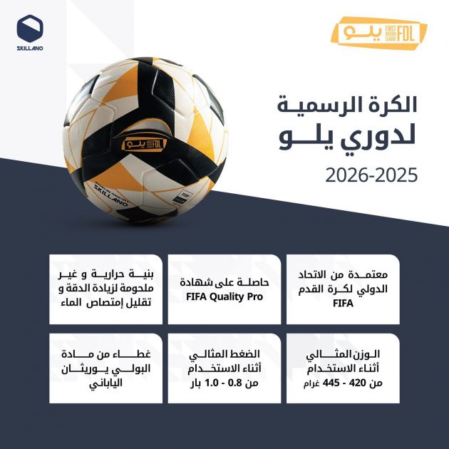 دشنت رابطة أندية دوري الدرجة الأولى للمحترفين الكرة الرسمية لدوري يلو للدرجة الأولى للمحترفين للموسم الرياضي 2025-2026، وذلك ضمن شراكتها مع العلامة التجارية “سكيلانو” العلامة التجارية السعودية في عالم الملابس والمعدات الرياضية.