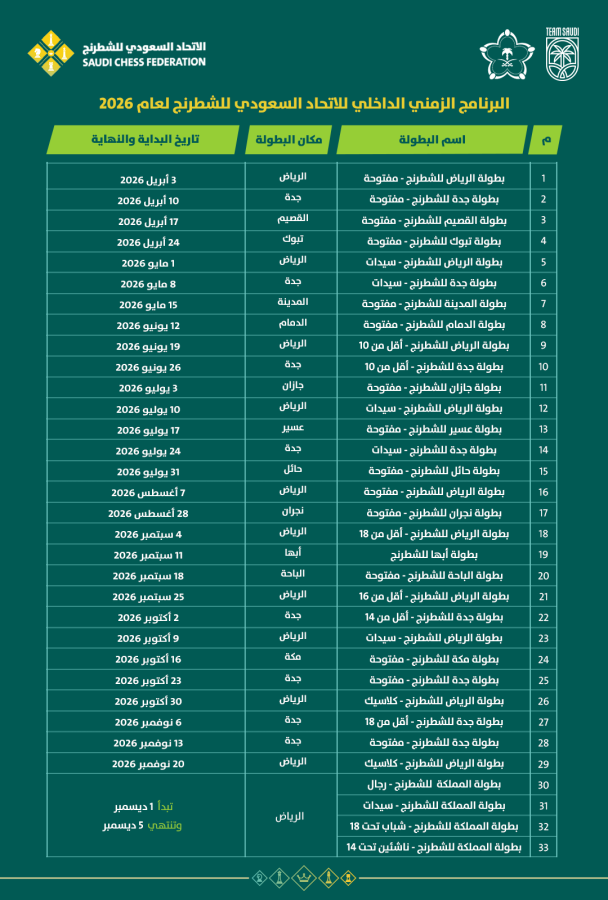 يعلن الاتحاد السعودي للشطرنج عن روزنامة بطولاته لعام 2026م. والتي تصل إلى 33 بطولة في مختلف مناطق المملكة ولجميع الفئات.
